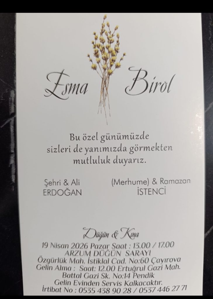 Şehri ve Ali Erdoğan’ın kızı ESMA’NIN 19 Nisan 2026 pazar günü saat 13.00 – 17.00 arasında Çayırova/Kocaali’de düğünü vardır, bütün dostlarımız davetlidir.